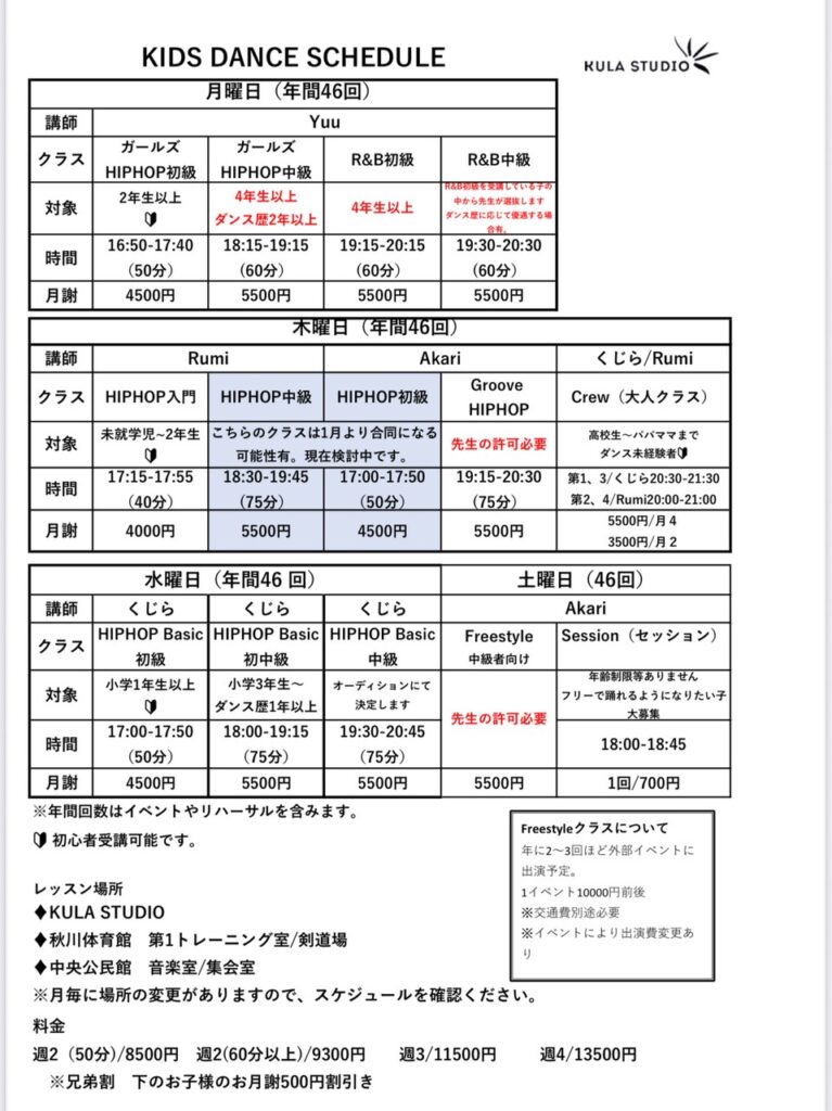 クラスの受講年齢やダンス歴はあくまでも目安となりますので、レベルに達している場合は学年やダンス歴は関係なく受け入れ可能です。